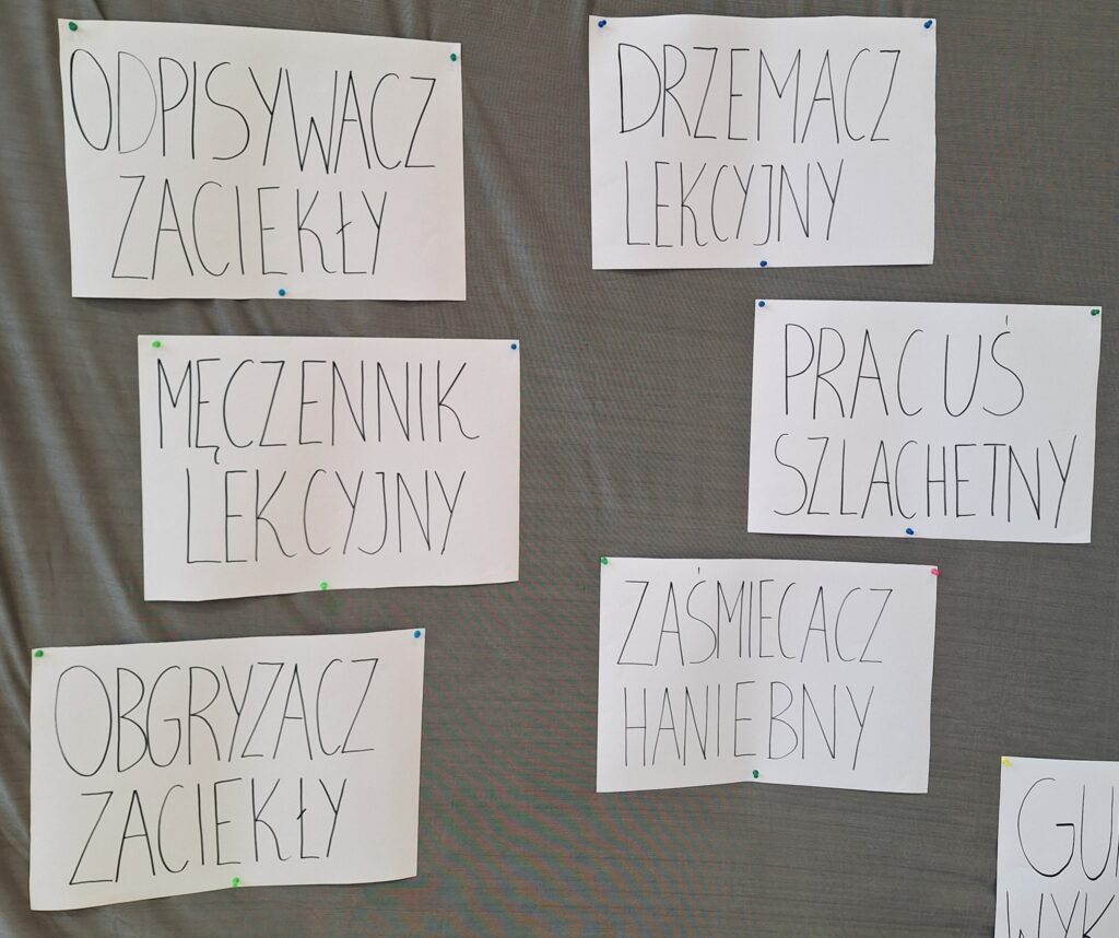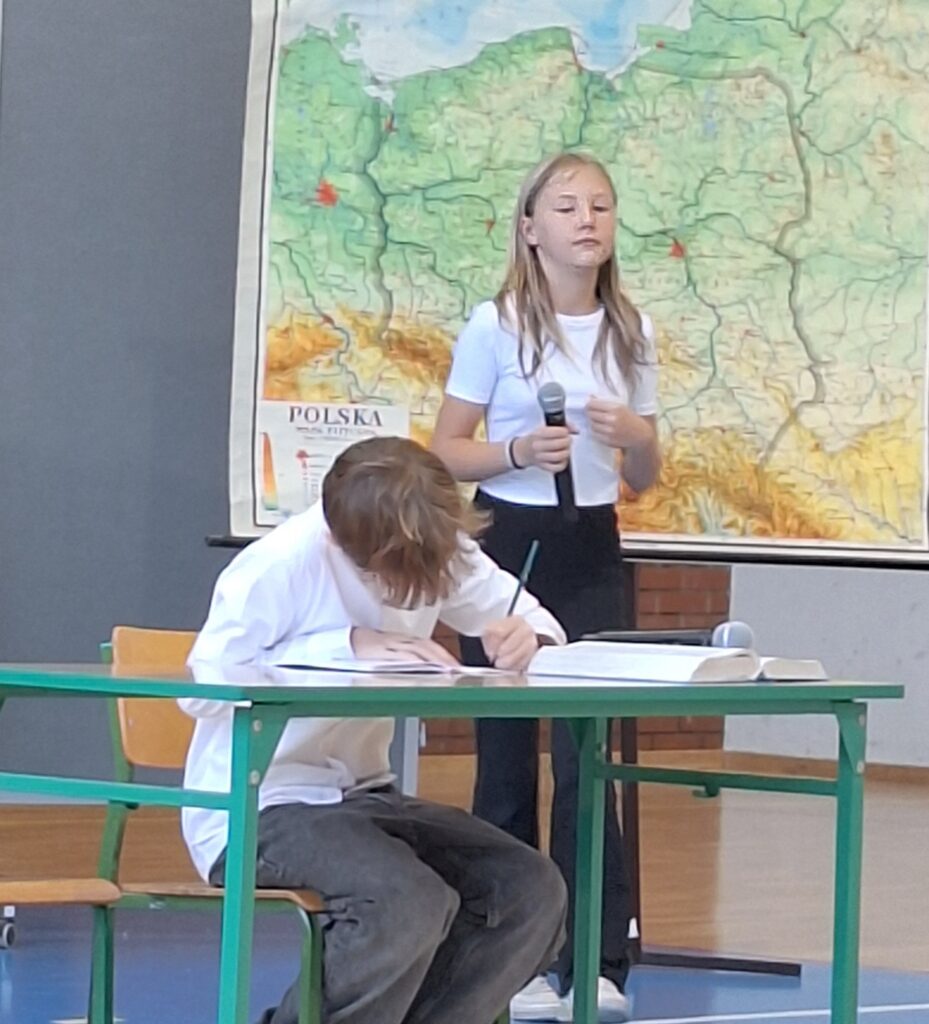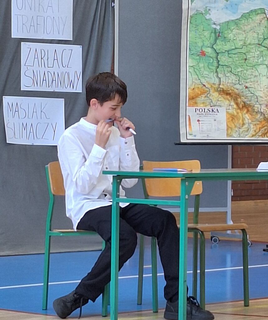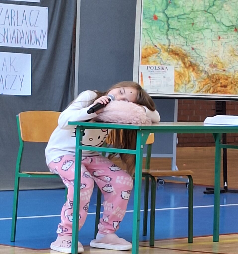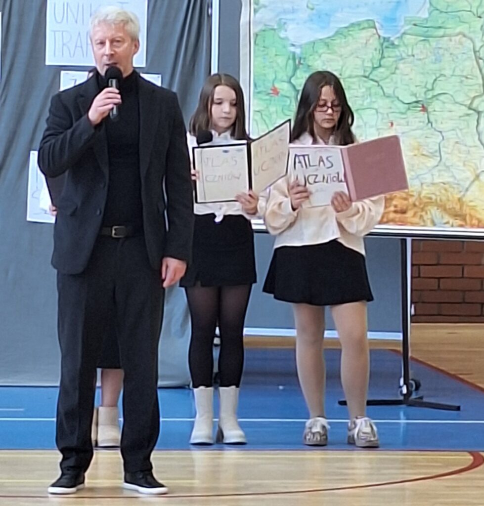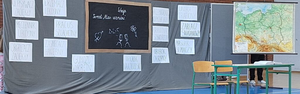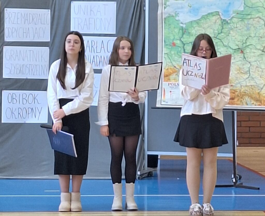 Z tej właśnie okazji połączone siły klas piątych sprezentowały całej społeczności swój program artystyczny „Atlas uczniów” – a w nim w barwny i dowcipny sposób dokonały krótkiego przeglądu i analizy osobników uczniowskich![]()
